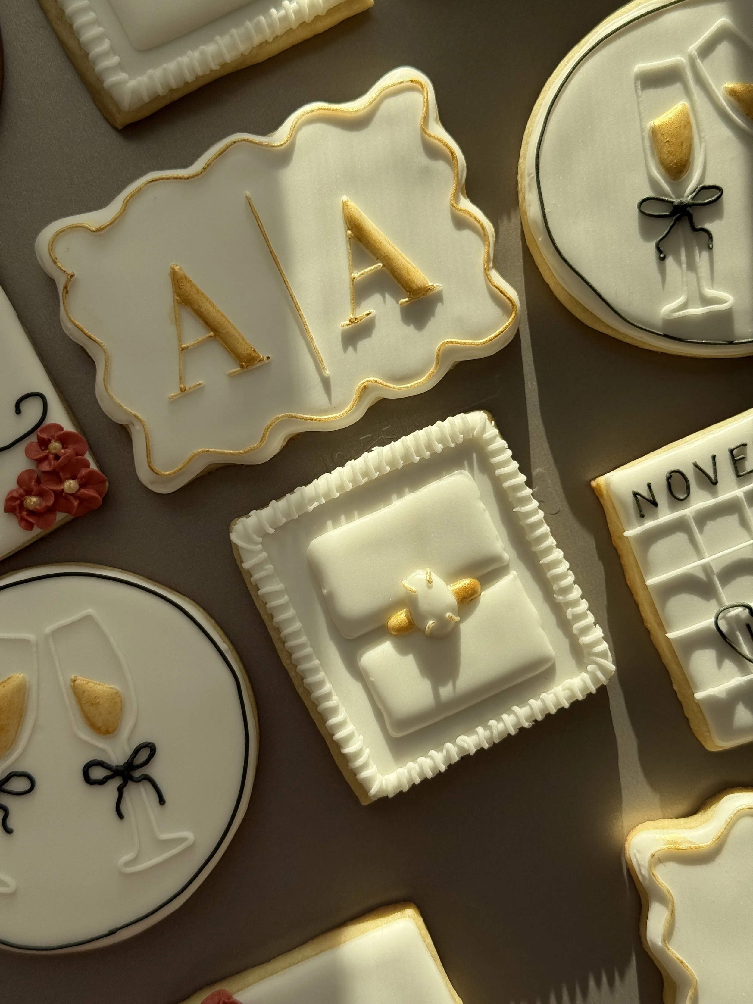 Our basic tier includes up to 4 cookie designs and 3 icing colors plus white. Each cookie is decorated with simple fonts and clean, classic details — no metallics or intricate elements. This option is perfect for anyone wanting a sweet, custom touch without all the extra frills.
